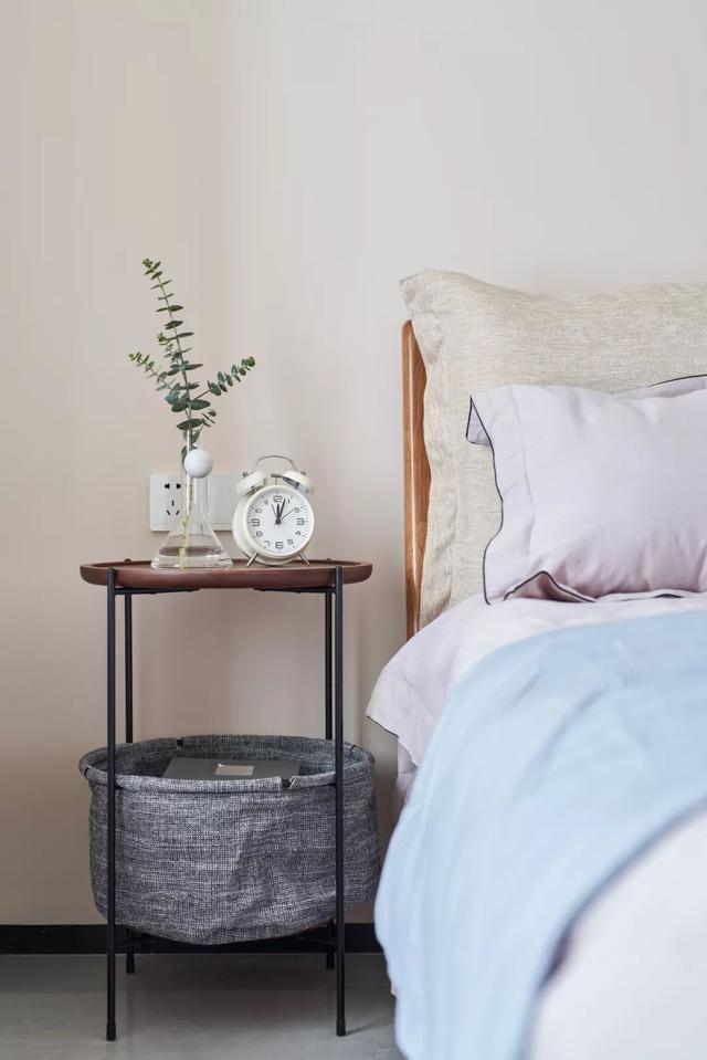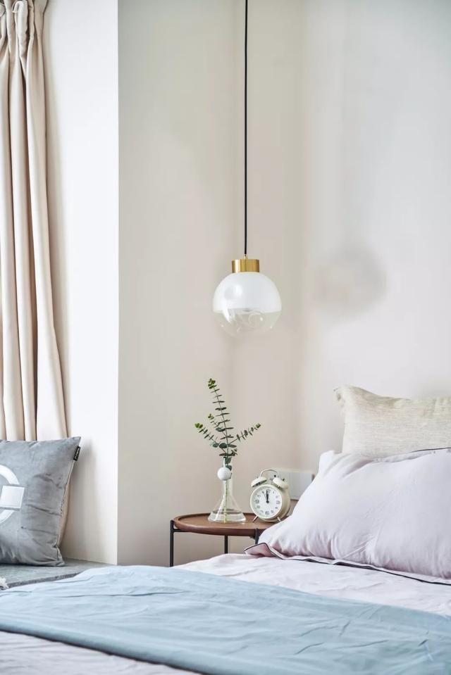 ▲靠窗一側(cè)的床頭布置了一個(gè)簡易的床頭柜,布置了一個(gè)鬧鐘與一個(gè)小花瓶,搭配一盞圓形吊燈,顯得清新而又舒適愜意。