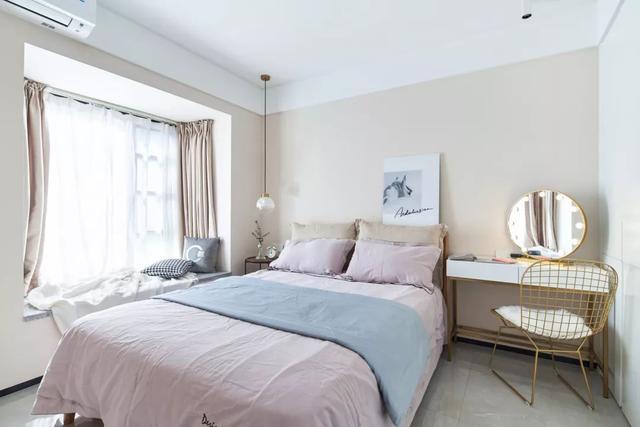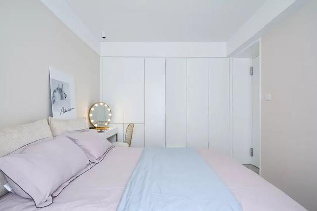 ▲白色的衣柜旁邊是一個(gè)梳妝臺(tái),搭配黃銅色的座椅與梳妝鏡,顯得格外的優(yōu)雅精致。