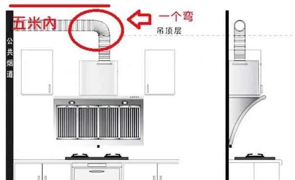 吸油煙機(jī)風(fēng)管不過(guò)5米、避免1個(gè)以上彎折。