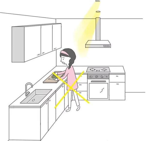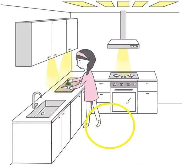 廚房若只有天花板照明是不足的,原因在于當(dāng)使用者在水槽、備料區(qū)作業(yè)時(shí),身體會(huì)遮擋住天花板的光線,例如下圖紅框圈起來(lái)的區(qū)塊,看上去就略顯陰暗。