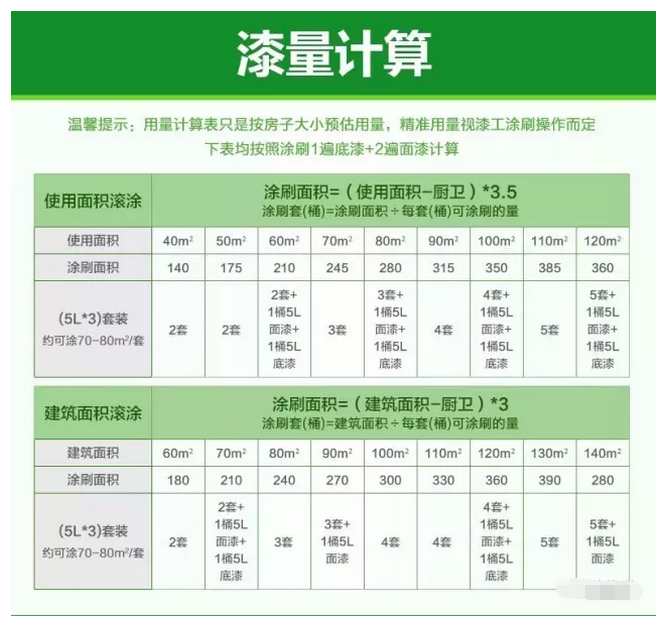 5L裝的底漆,刷一遍,理論刷涂面積60~70㎡(每升13~14㎡),具體總量計算可以參考下表。(下面的1套的意思就是1桶底漆+2桶面漆)