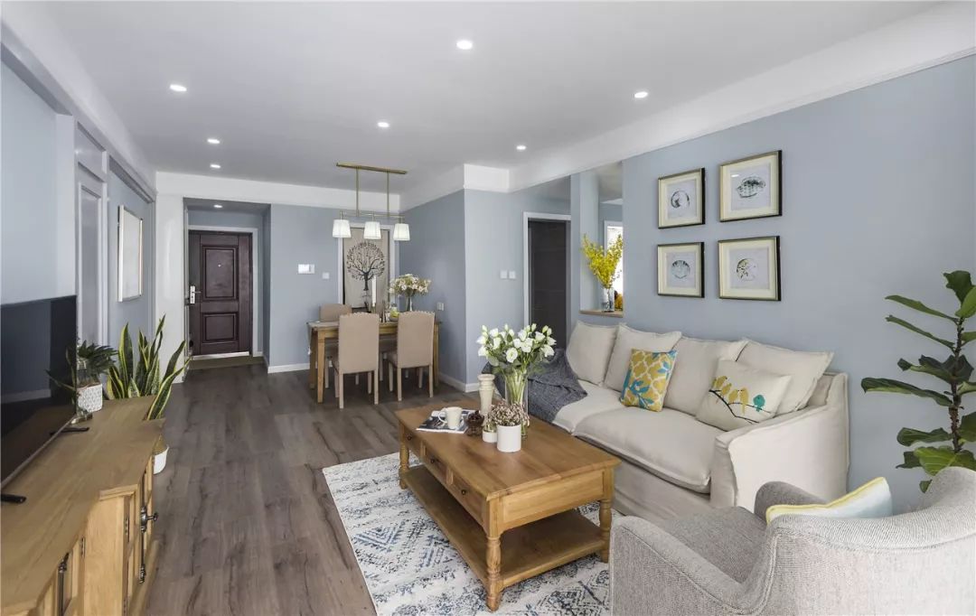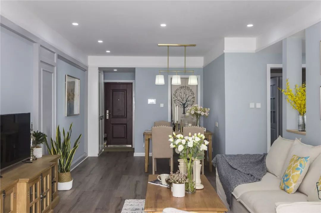 ▲ 客廳整體以淡藍(lán)色為基調(diào),搭配復(fù)古質(zhì)感的木質(zhì)家具與地板,整體舒適雅致不失自然愜意。