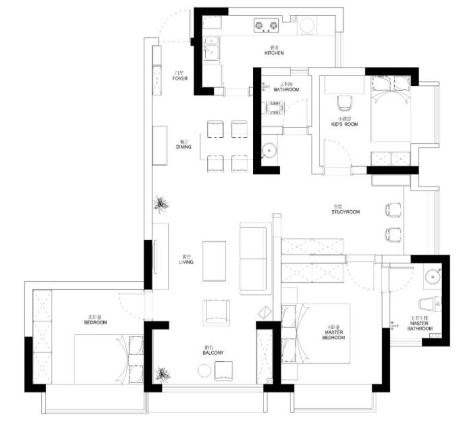 ▲ 整個客餐廳空間的吊頂上布滿了筒燈,在餐廳區(qū)域裝了一盞金色吊燈來增添空間的精致感。