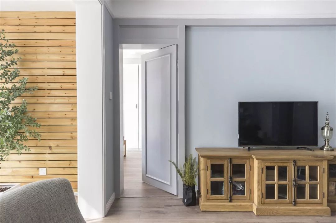 ▲ 電視墻左側(cè)還有一扇隱形門,與電視墻邊框造型結(jié)合一體非常和諧,木質(zhì)電視柜沉穩(wěn)而有質(zhì)感,充滿了復(fù)古格調(diào)。