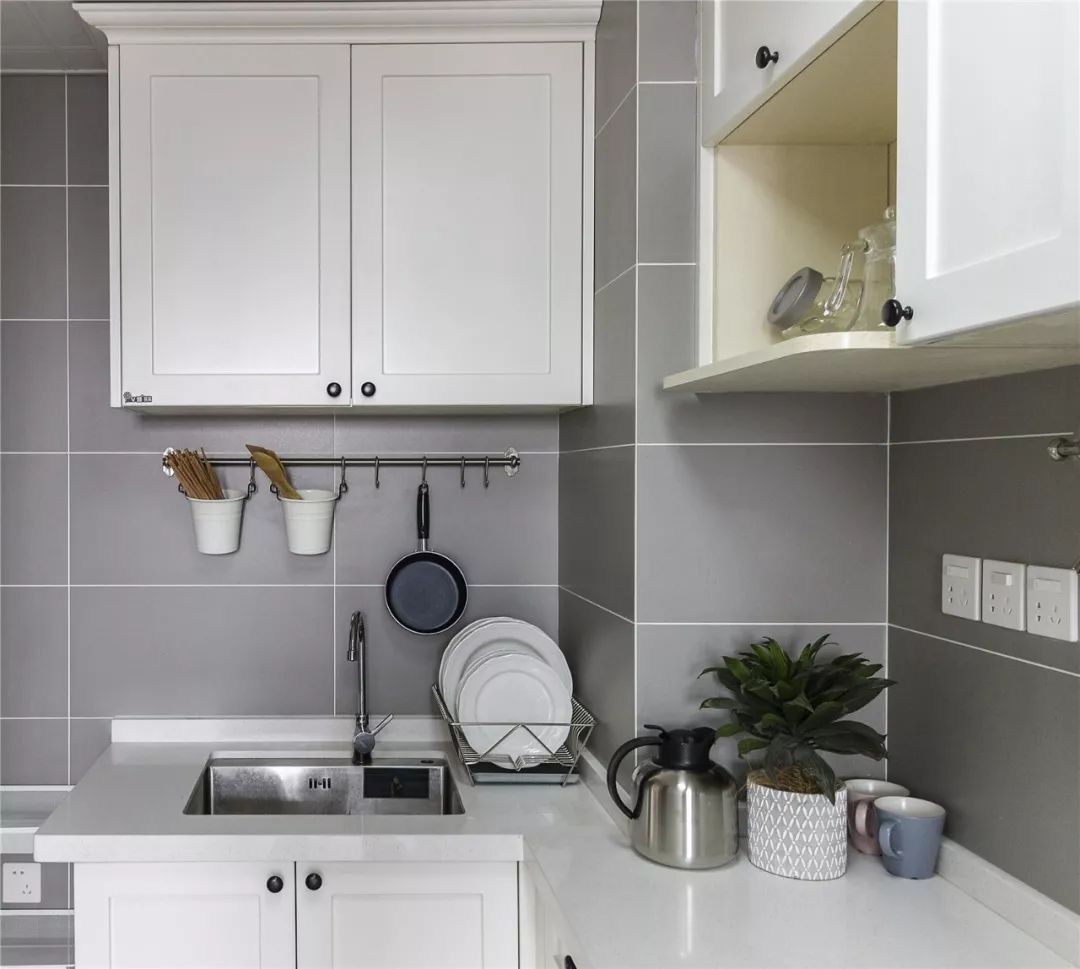 ▲ 廚房墻面設(shè)置掛桿,讓廚具有個便于取放的收納之處,灰色基調(diào)搭配白色的櫥柜,讓烹飪氛圍簡約又輕松。