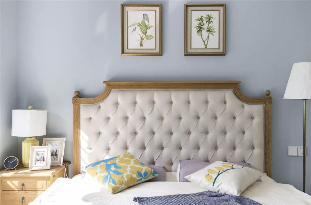 ▲ 軟包床頭符合人體貼合舒適度,整體營造安逸自在的睡眠氛圍。床頭背景墻選用兩幅植物掛畫作裝飾,配以繽紛的抱枕,增添空間色彩。