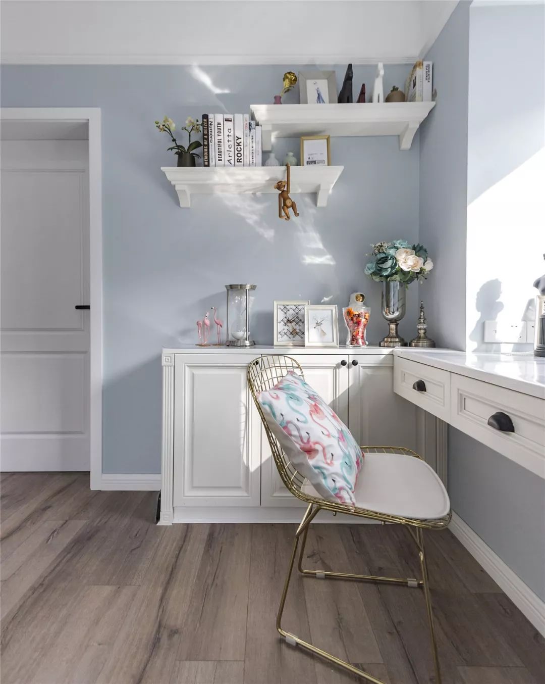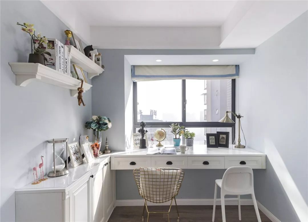 ▲ 書房延續(xù)藍(lán)白調(diào)的風(fēng)格,與羅馬簾相互呼應(yīng)。雙人書桌靠窗設(shè)置,桌面擺放精致的裝飾品,提升空間品位與格調(diào)。