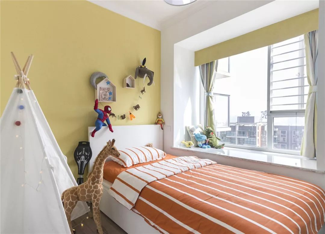 ▲ 兒童房以充滿活力感的黃色為主調(diào),靠窗擺放的兒童床搭配橙色條紋床品,背景墻掛上可愛的小墻飾,還有地上軟萌的帳篷,使空間充滿了童趣感。
