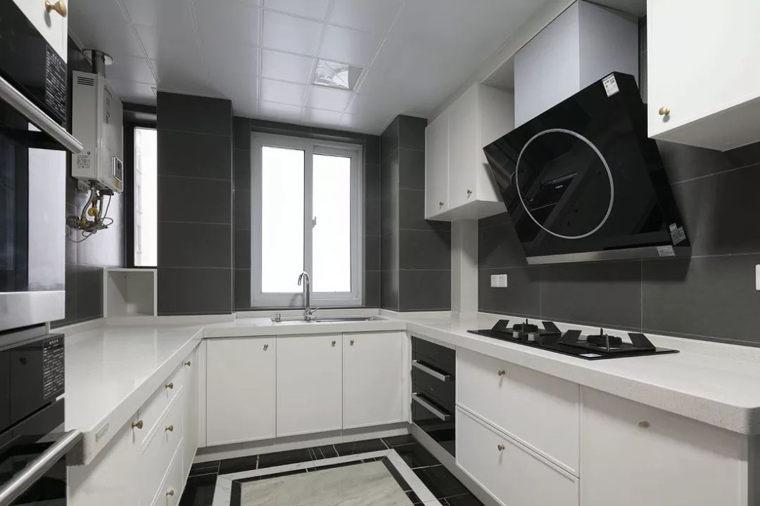 ▲ 廚房整體用白色櫥柜搭配黑色家電,簡(jiǎn)約至上,又不失時(shí)尚感。