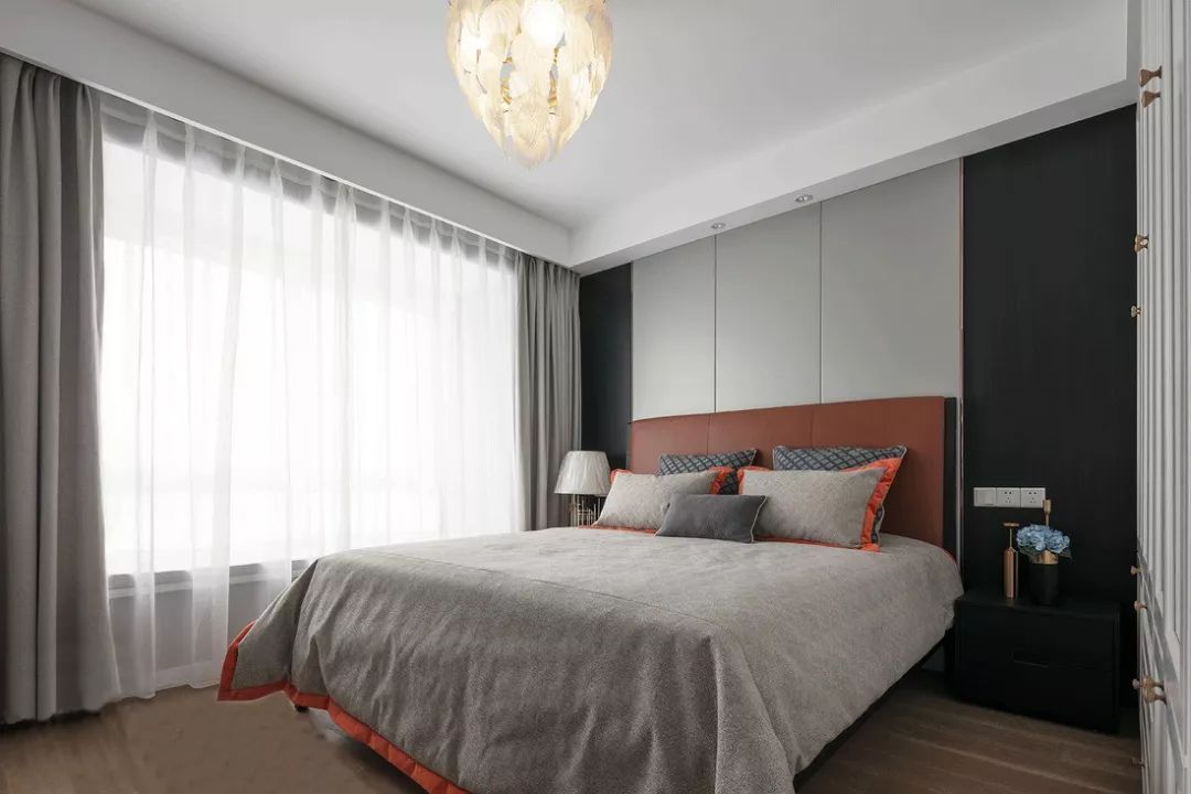 ▲ 黑白灰作為經(jīng)典色被運(yùn)用到了主臥之中,加上橙色軟裝的點(diǎn)綴,讓整體不顯沉悶,高雅奢華許多。