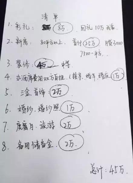 前兩天網(wǎng)上看到一個貼,說是一個男生嫌女朋友太物質(zhì),因為女生列出了這樣一個結(jié)婚清單,其他不說了,4萬裝修還是中等,我都懷疑自己的眼睛。