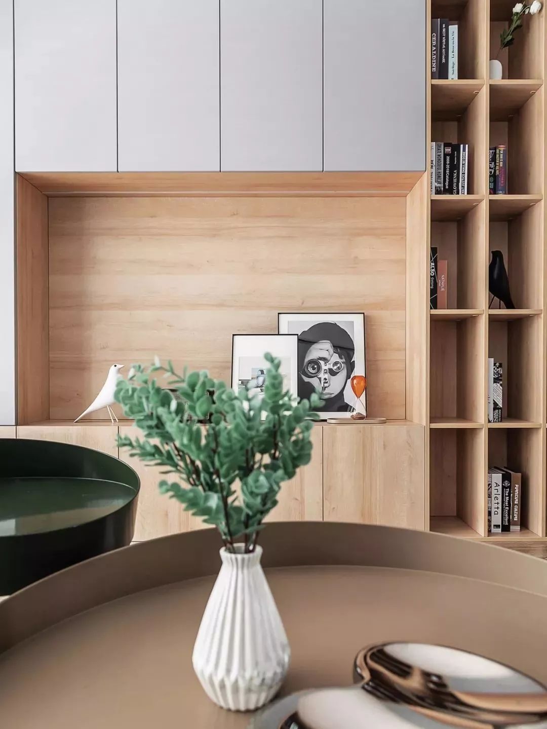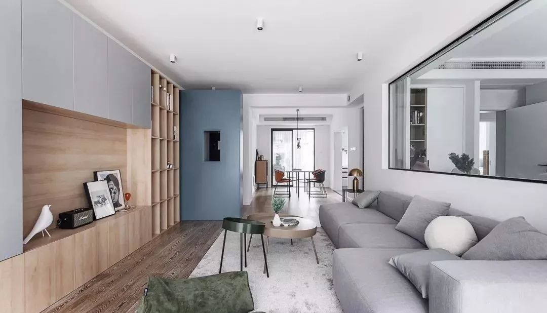 ▲ 整墻電視柜作背景,半開半合設(shè)計(jì),豐富空間層次與柜體使用功能,灰+木色柜體平衡視覺