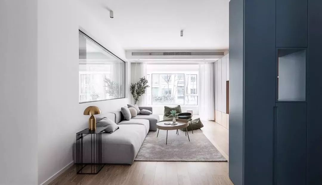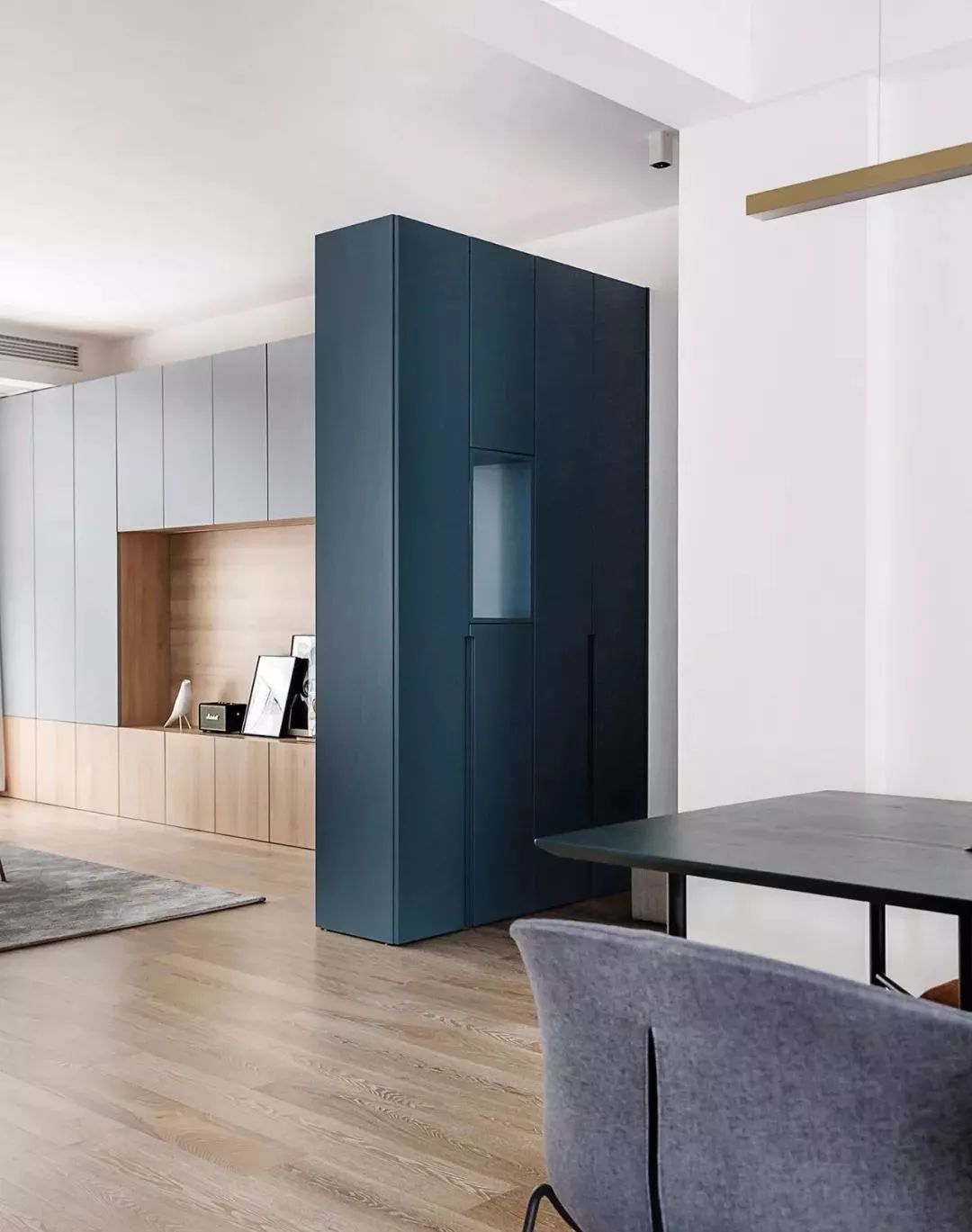 ▲ 入戶,霧霾藍(lán)鞋柜分隔出獨(dú)立玄關(guān)區(qū),中部開小口增強(qiáng)光線滲透