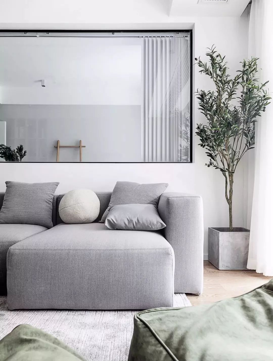 ▲ 灰色布藝沙發(fā)搭配淺綠色懶人沙發(fā),綠植帶來清新自然氣息