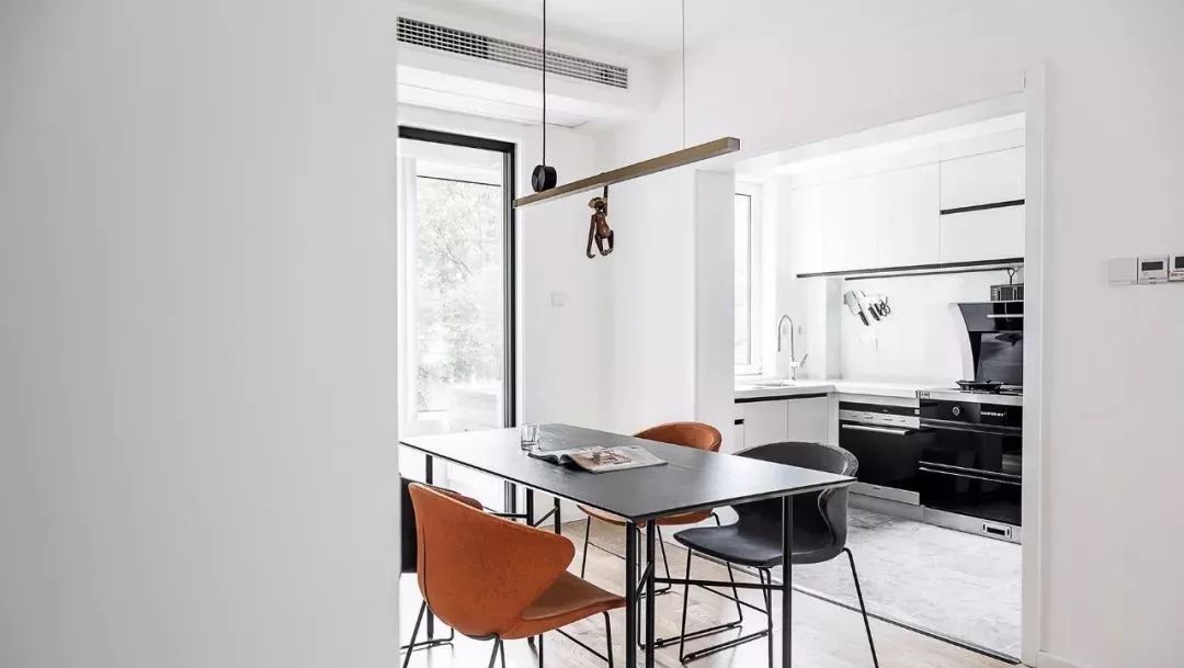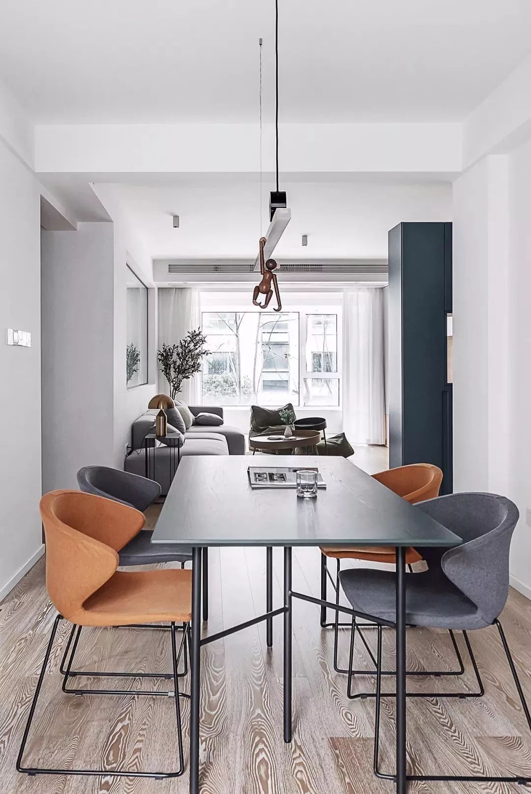 ▲ 餐廳,墨綠色餐桌搭配橙灰色餐椅,極簡頂面點(diǎn)綴長條形吊燈與猴子掛件