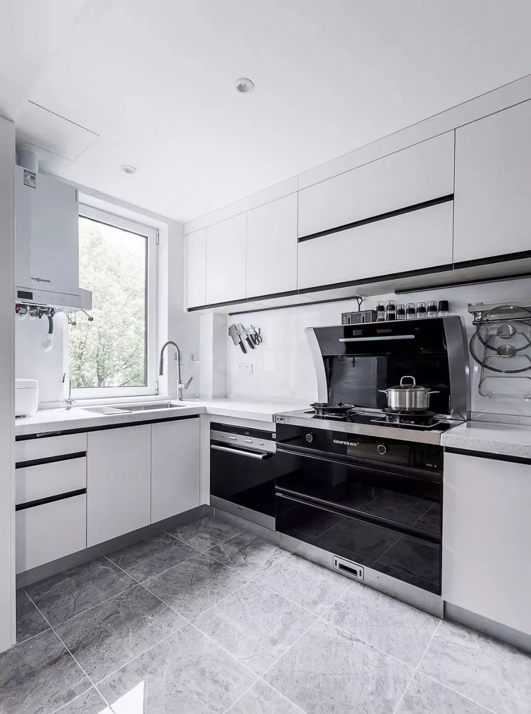 ▲ 廚房,以黑白灰為基調(diào),整體干凈利落,隱形把手設(shè)計(jì),現(xiàn)代感十足
