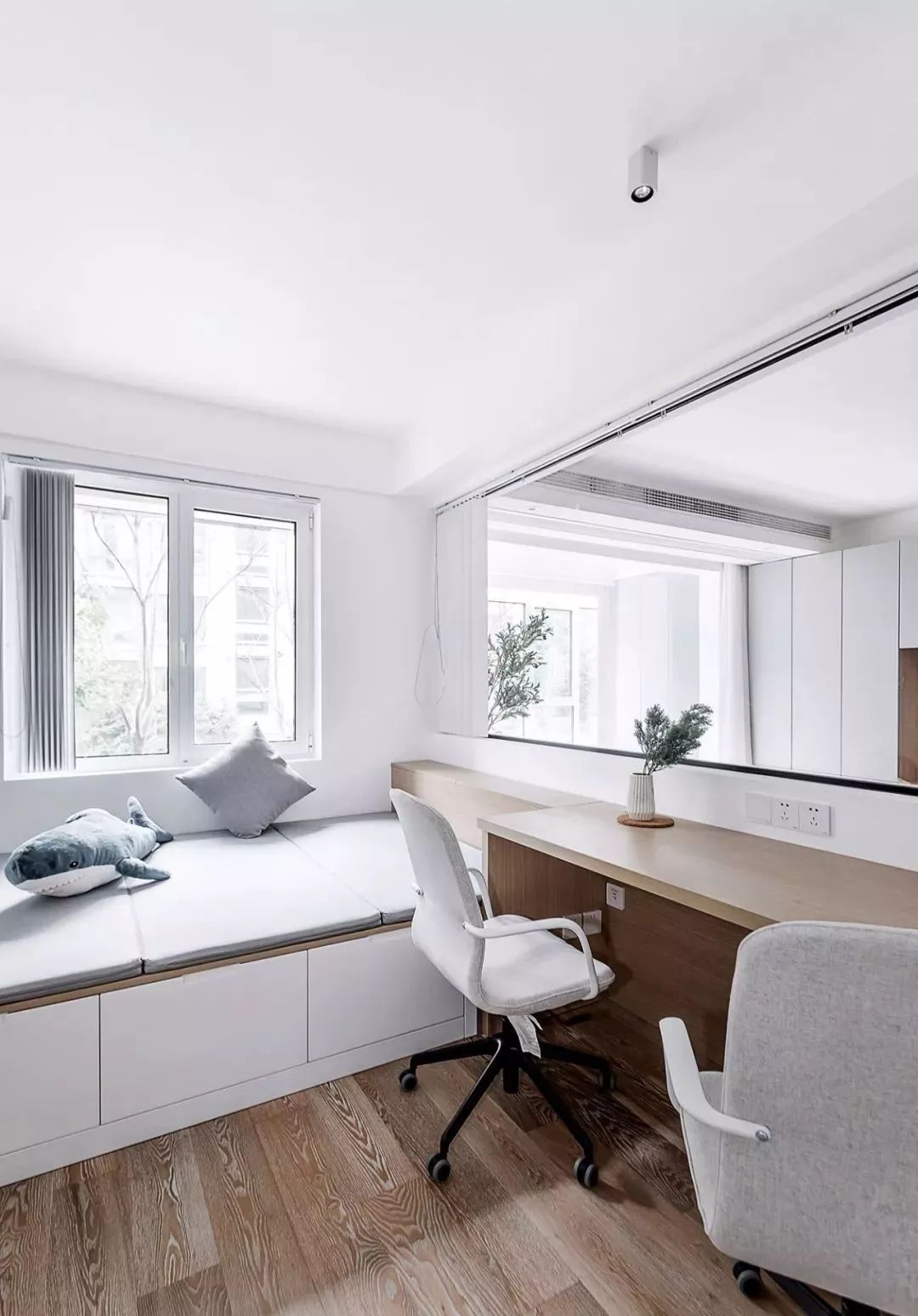 ▲ 多功能房,定制儲(chǔ)物榻榻米加雙人位書桌設(shè)計(jì),兼具書房與客臥功能