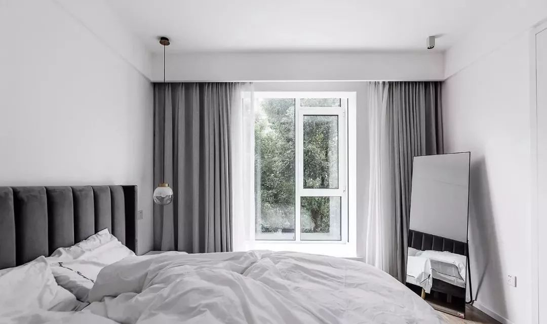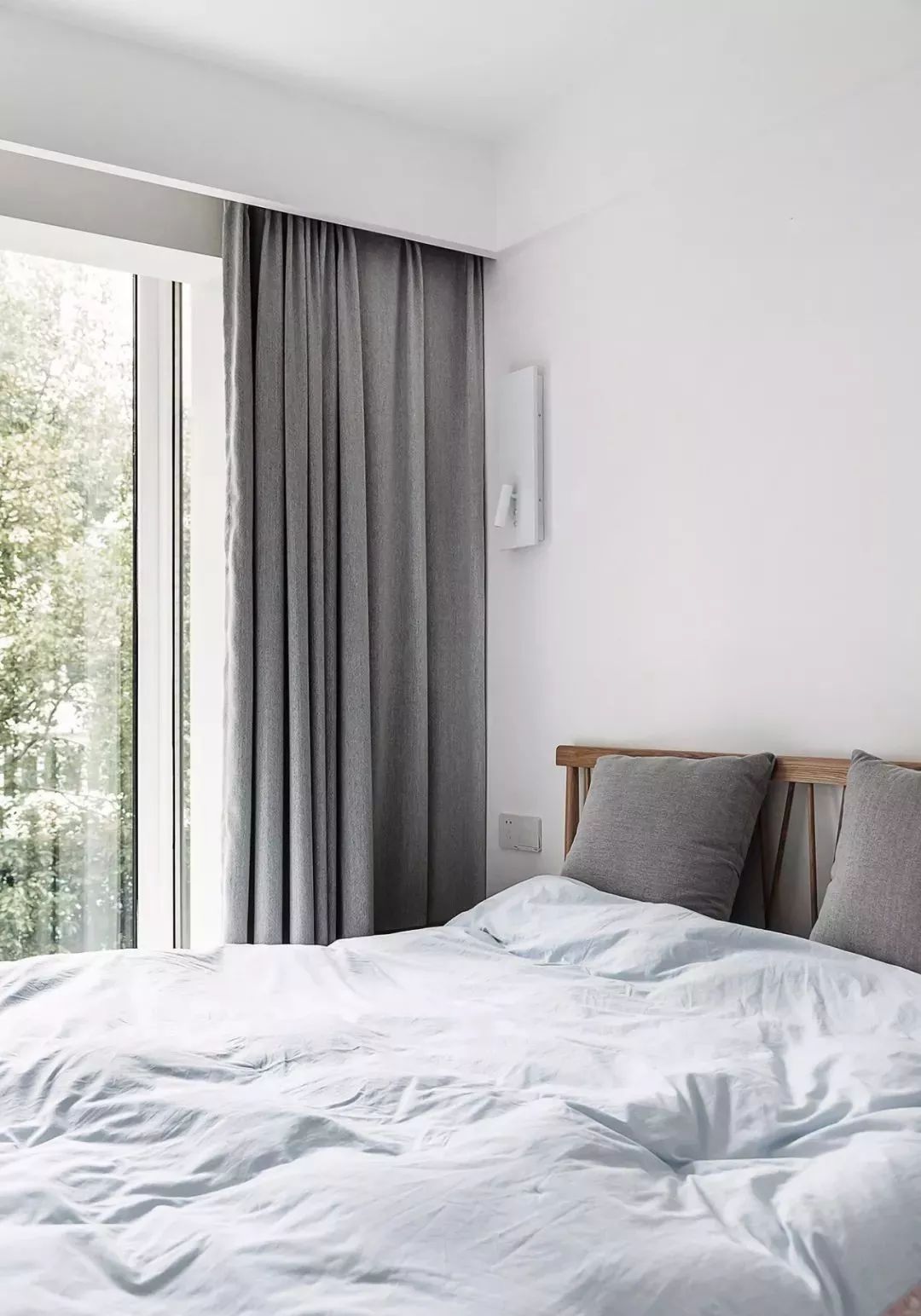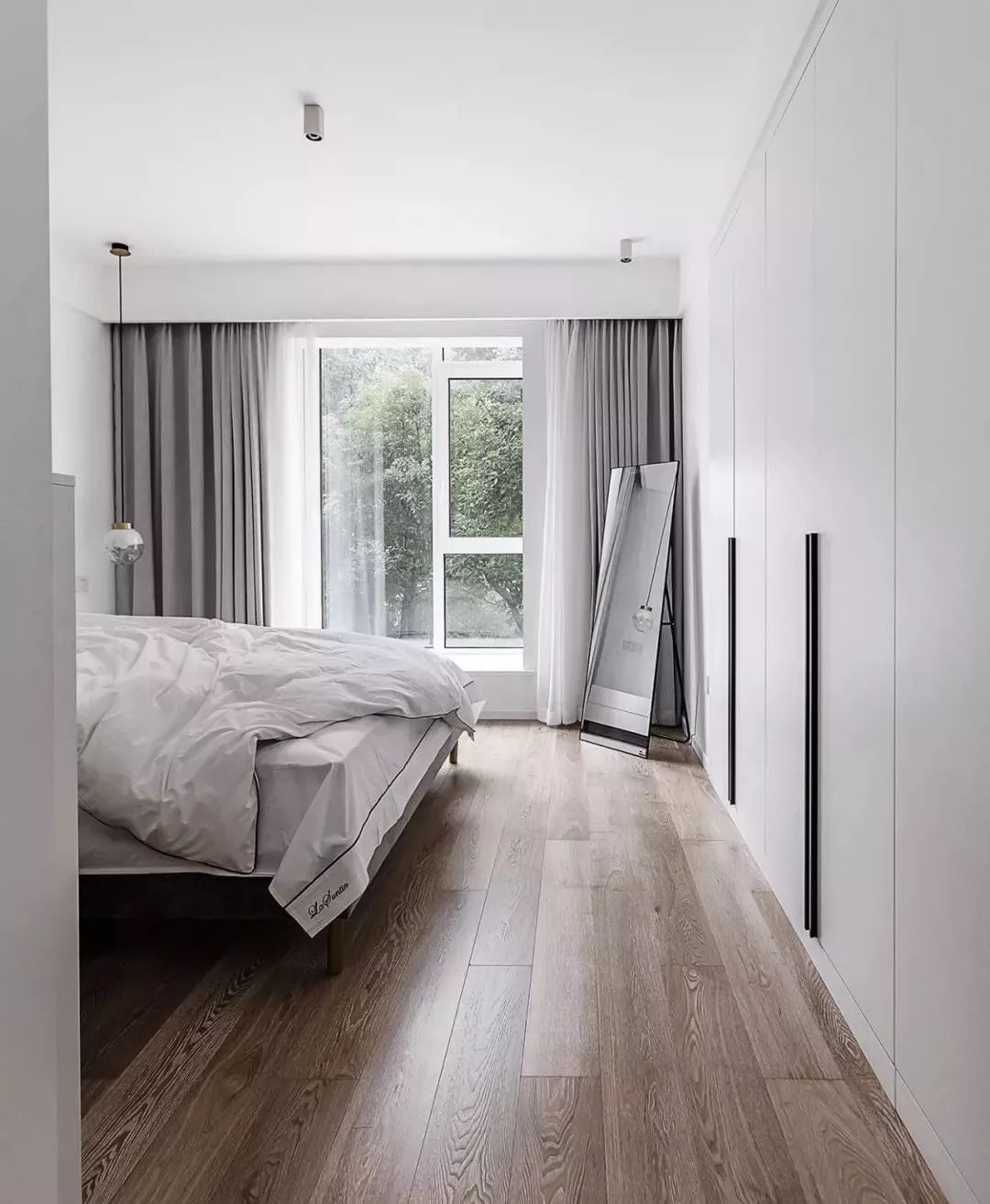 ▲ 主臥,延續(xù)灰白基調(diào),床尾設(shè)計(jì)大面積白色定制柜,使空間更加整體