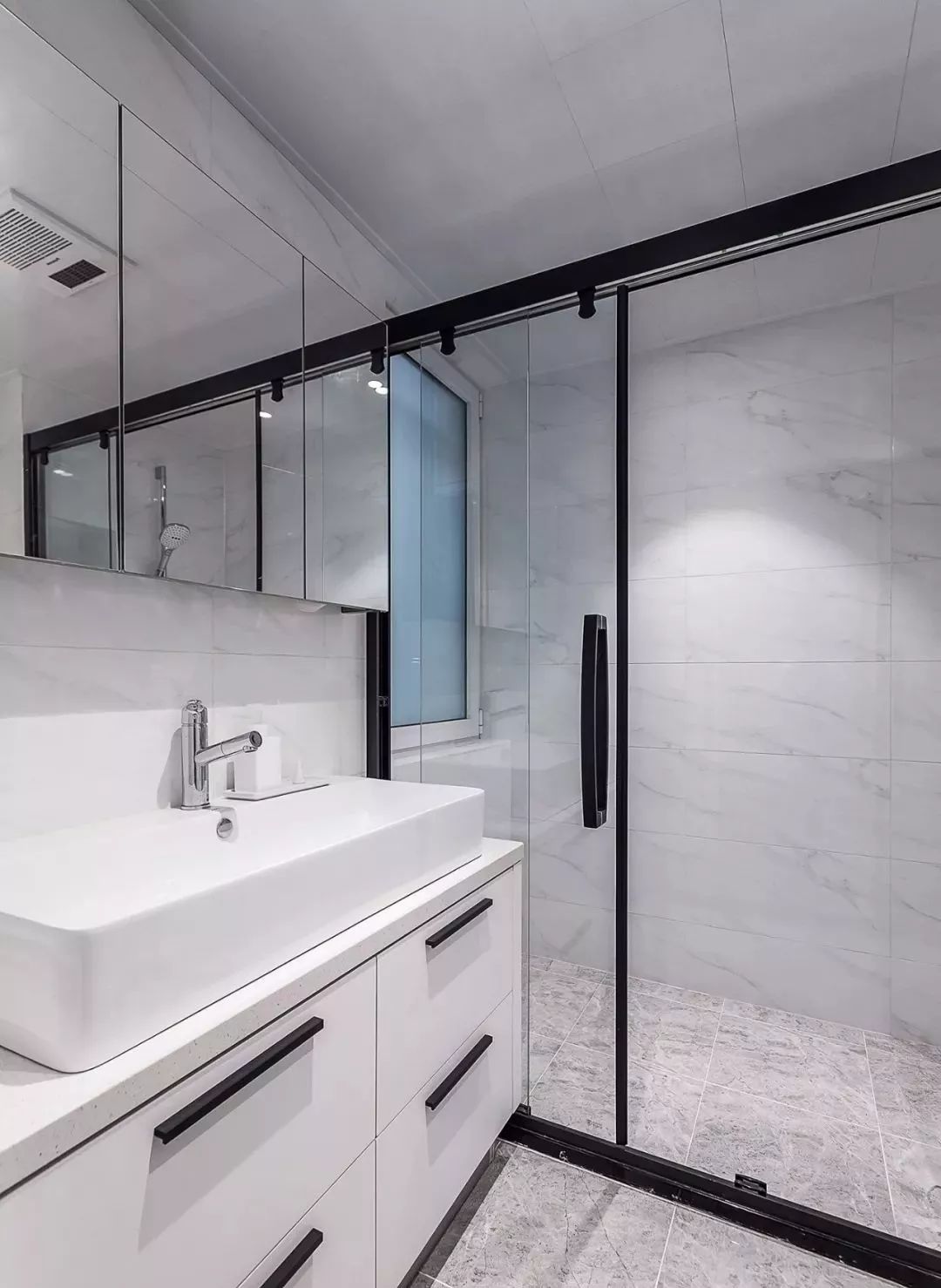 ▲ 衛(wèi)生間,淺色空間加入黑色線形把手點(diǎn)綴,鏡柜與抽拉龍頭方便實(shí)用,黑框玻璃移門劃分出淋浴空間