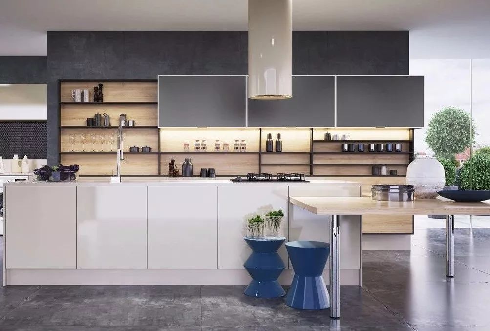 如果你擔(dān)心大面積的灰色,會讓廚房顯得有些“清冷”,不妨大膽地加入一些原木材質(zhì)來點綴,使整個空間看起來更有層次,也瞬間多出幾分溫暖的味道。
