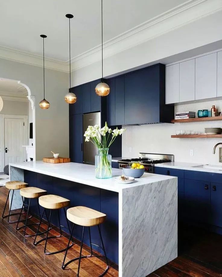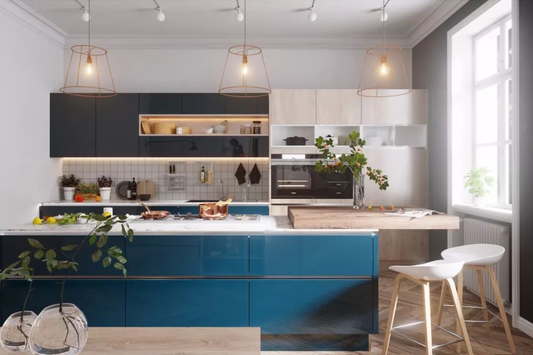 藍色廚房兼具優(yōu)雅和高冷范兒,它本身的氣質(zhì)比較清新,再加上金屬吊燈、大理石元素以及綠植作為裝飾,更能打造出一個令人心動的治愈系廚房,讓平日日“十指不沾陽春水”的男士,也會忍不住愛上。