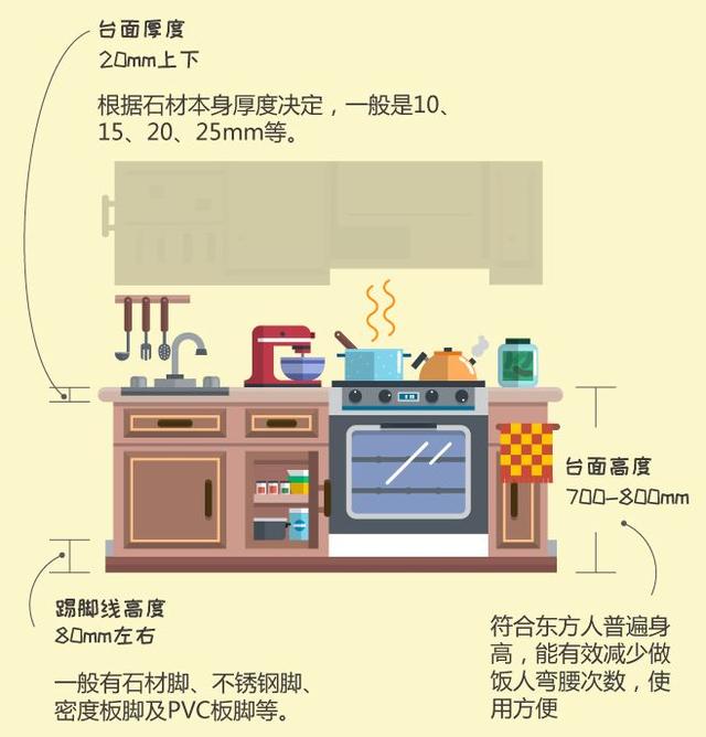 (1)臺面高度:臺面高度一般在70-80cm左右,這是由東方人的身高決定的。
