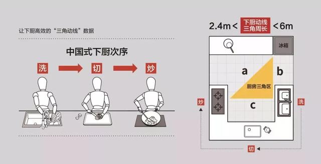 根據(jù)中式做飯的習(xí)慣,廚房的動線通常都是基于“洗-切-炒”出發(fā)的。“民以食為天”,咱們中國人對吃還是非常講究的,下廚做一頓中餐所用到的配料、工序都比較多,合理地把流程中用到的東西分布并以合理的動線布置,會讓做飯省力不少,避免做頓飯都要忙得團團轉(zhuǎn)。