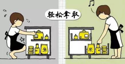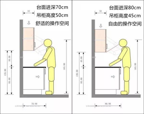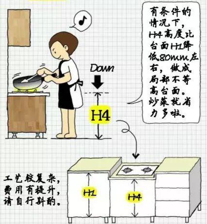 (2)灶臺高度:當(dāng)你把臺面高度調(diào)整到洗菜切菜都很舒服的時候,問題又來了。炒菜的時候,這個高度可能會讓我們的手腕用力過重。所以,如果有條件,操作臺的高度和灶臺高度也建議做成不一樣。