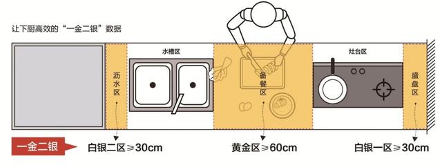 而在動線的基礎(chǔ)下,每個動線之間留出足夠的操作臺面也是非常重要,否則動線再好,洗好的菜跟出鍋的菜沒地兒放,還是要來回走動,下圖是各個操作區(qū)需要預(yù)留的尺寸參考。