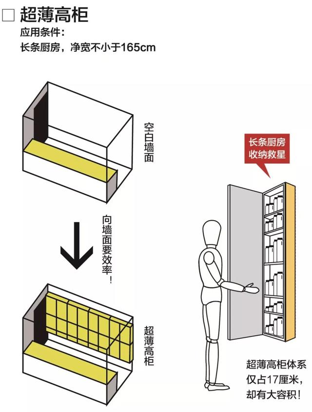 有不少小戶型的廚房,只能做一字型或L字形的布局,而通道多出了一個20-30cm左右的空間,想做廚柜又太小,所以只能是浪費閑置;其實這個空間,也是可以定制上一個薄薄的收納柜,用來存放瓶瓶罐罐或干貨的話也是剛剛好,還不會太深不方便取用。