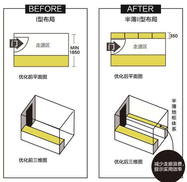 經(jīng)過增加一排的薄柜,廚房的布局也可以可以從Ⅰ字形的廚房變身Ⅱ字形的廚房,經(jīng)過這么優(yōu)化,不僅增加了廚房的收納,廚房的操作動線也相應(yīng)地縮短,真的是非常巧妙的設(shè)計。