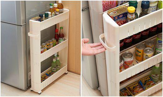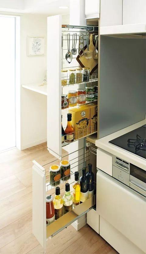 (2)角落里的見縫插針:很多時候,廚電家具和墻壁之間都會不會嚴絲合縫,往往會留下一些縫隙。而這些縫隙好好利用的話,也能成為最好的收納空間。