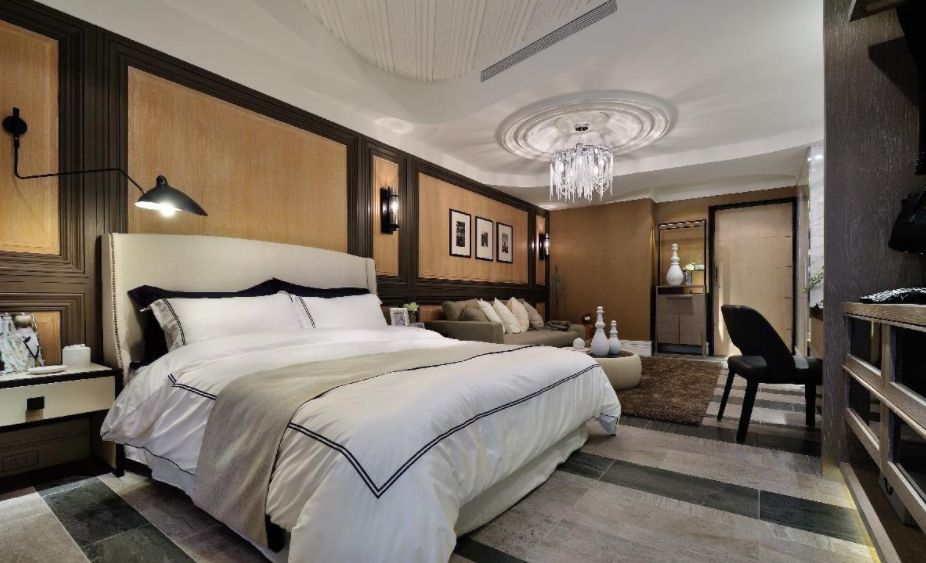 利用大面積黑白跳色的石紋磚引導(dǎo)小坪數(shù)空間的風(fēng)格,映襯奢華水晶吊燈,以及鏡面質(zhì)材,讓奢華時尚風(fēng)格不侷限于家具及立面的表現(xiàn)上。