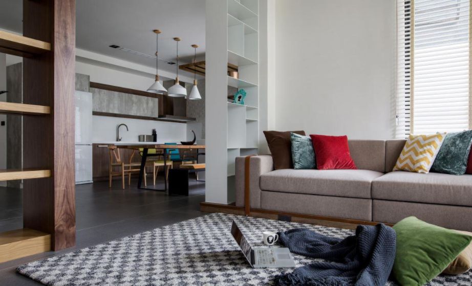 客廳與臥房運(yùn)用相同的胡桃木鋪排,深淺跳色以及木頭紋理,讓居家溫暖、自在調(diào)性冉冉而升,并利用地坪材質(zhì)的拼接,劃分出玄關(guān)及客廳場域。