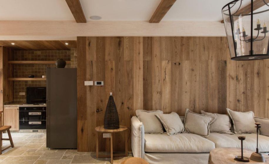 以森林小木屋為模板,藉由瓷磚的多變造型,讓自然質(zhì)感的特色石紋地磚,與客廳區(qū)的布面沙發(fā)、年輪茶幾、造型吊燈相合而一,營造出會呼吸的居家生活空間。