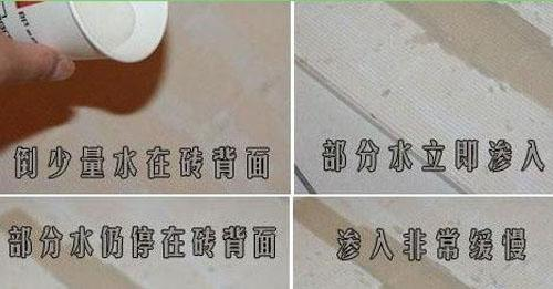 將瓷磚背面朝上,往背面灑點(diǎn)水,然后觀察瓷磚吸水的快慢。如果吸水的速度慢的話,說明瓷磚密度大;相反,密度稀疏,質(zhì)量沒有很好。瓷磚吸水率越低,說明瓷磚的抗污能力很好;相反則說瓷磚抗污能力差。