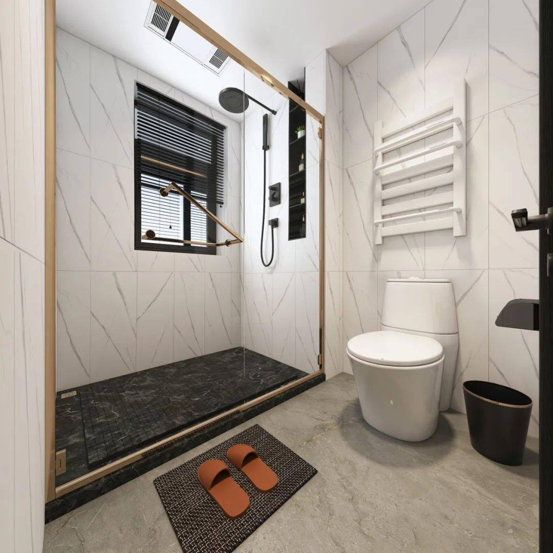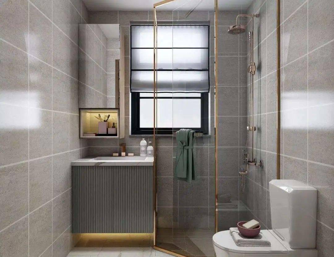 這是最常見的衛(wèi)生間形態(tài),占地面積小,卻也可以做出簡單的干濕分區(qū),滿足基本的使用功能。