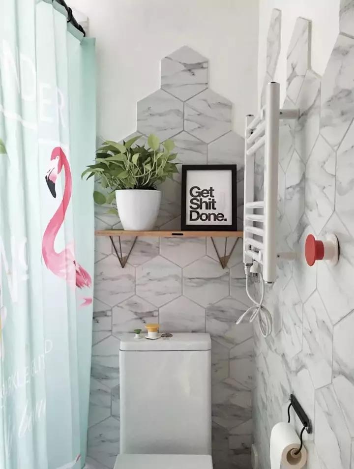 5、一盆綠植,一張畫,擺在擱板上讓衛(wèi)生間更加情調清新。