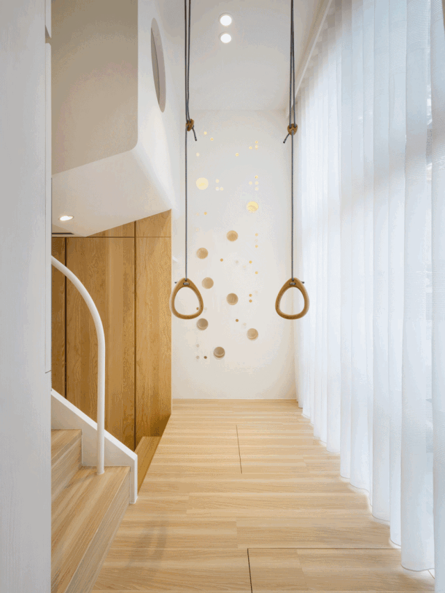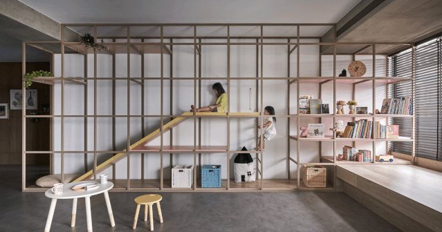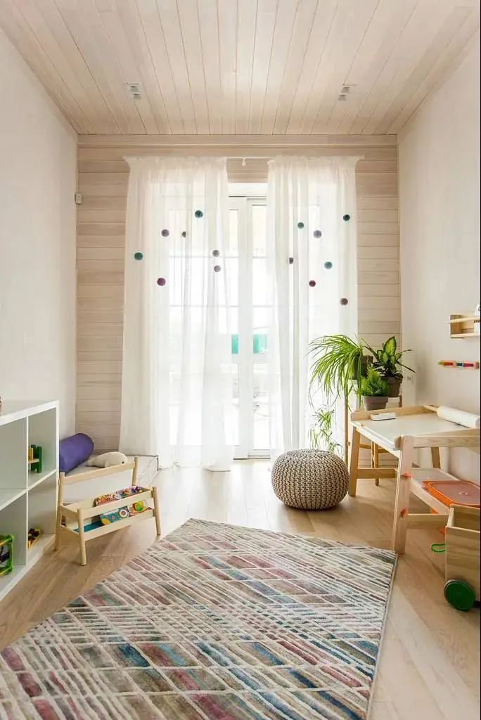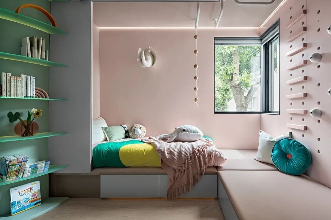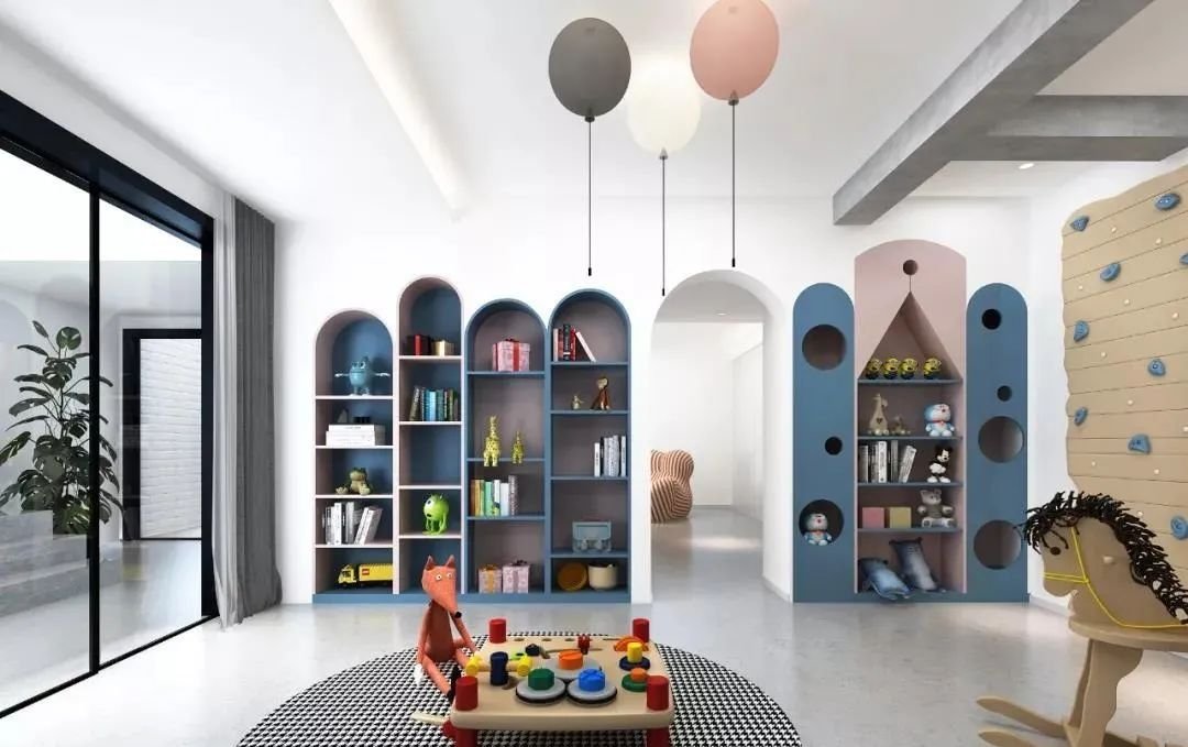 一個可供孩子玩耍的游戲空間非常重要,如果沒有專門的活動室,可以在客廳騰出一點空間來:比如靠墻搭建一面攀巖墻,讓孩子釋放體內(nèi)的洪荒之力或橫廳沙發(fā)后留出一小部分區(qū)域給孩子搭建一個滑梯、游戲廳等。