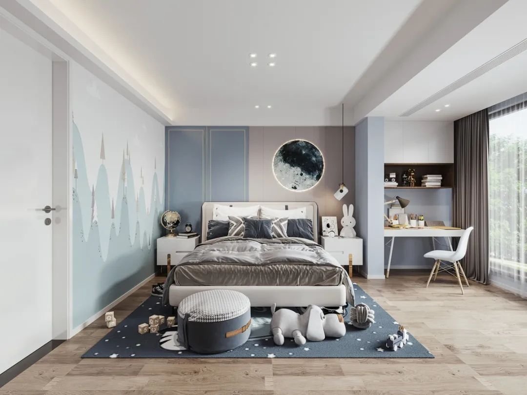 臥室一定是跟著孩子一起成長的空間,睡覺+收納+學(xué)習(xí),從小住到大。一整面靠墻柜,圖書角+學(xué)習(xí)桌+衣柜組合設(shè)計,一次性滿足學(xué)習(xí)+收納兩大需求。或利用轉(zhuǎn)角空間,從衣柜延伸出一張學(xué)習(xí)桌。床底也不放過,做收納型床。注意:別過分擁擠,床品、柜子等家具盡量靠墻,留出足夠空間給孩子自由活動。