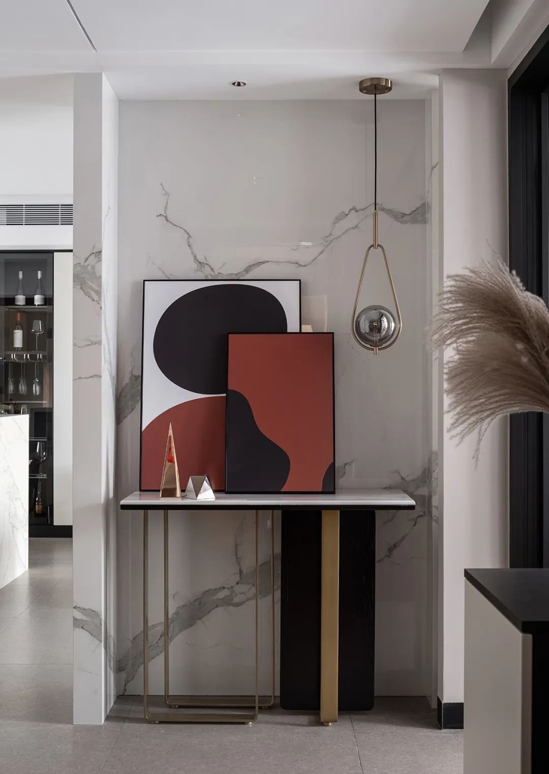 如果過道空間不足,無法實現(xiàn)整墻玄關柜的時候,可以選擇矮柜,墻面做點裝飾掛鉤、掛畫等,既實用也很有范。