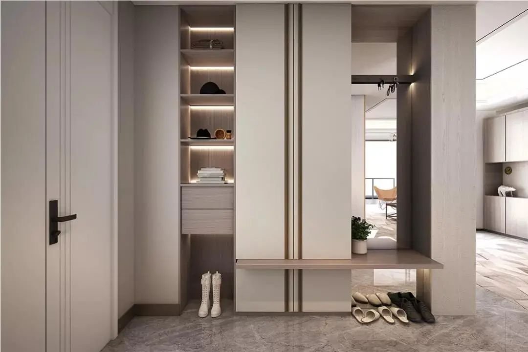 若門廳面積大,完全可以打造L型玄關柜,滿足鞋子+衣服+全身鏡+座椅等各大功能要求。