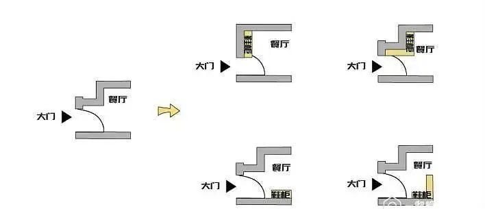 門廳是側出形式或者進門是一條橫向的過道,連接餐廳和客廳,大門對面是墻壁