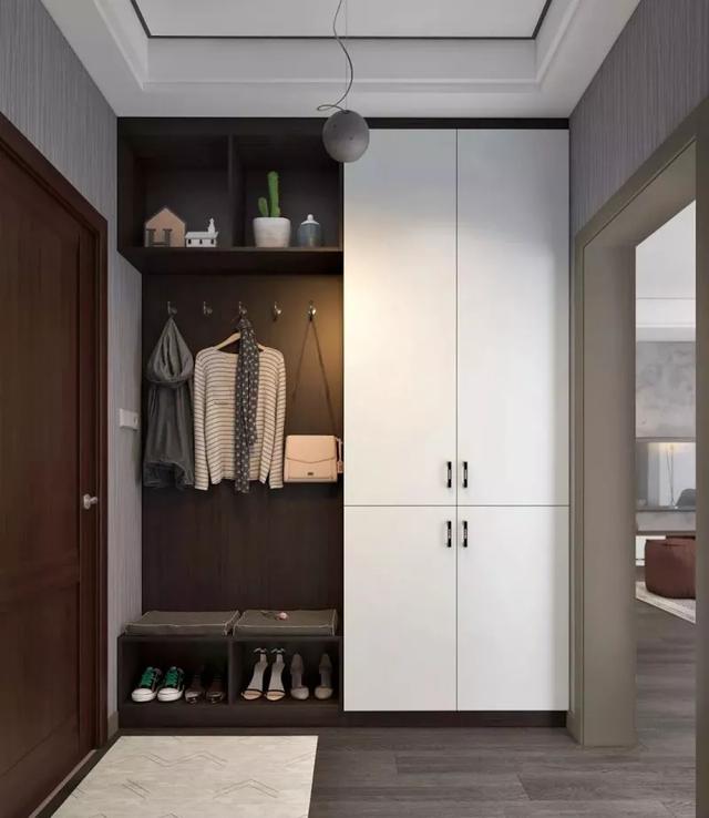 將衣柜、收納、鞋柜融為一體,多功能的收納區(qū)間,適合家庭成員多的家庭。