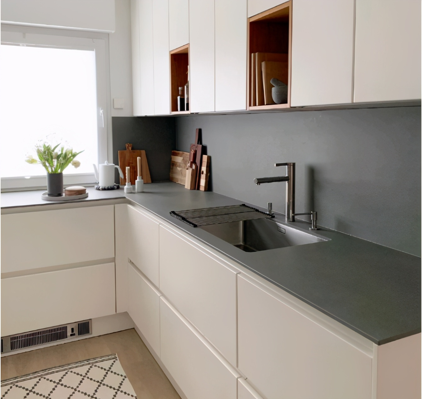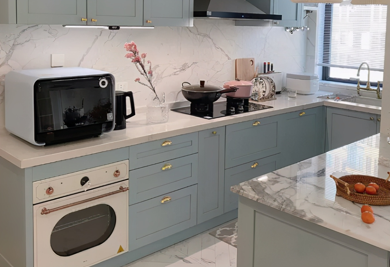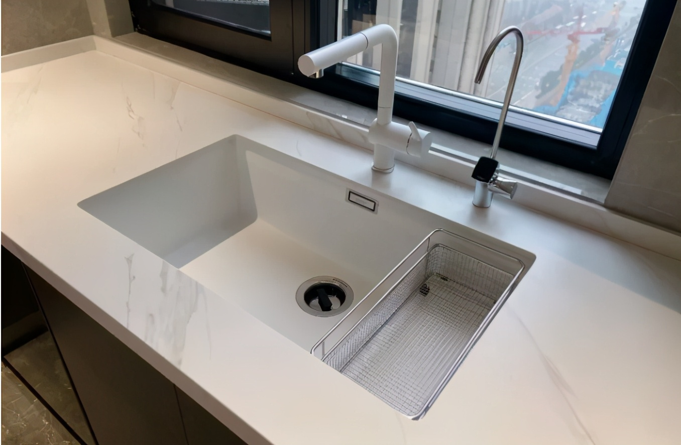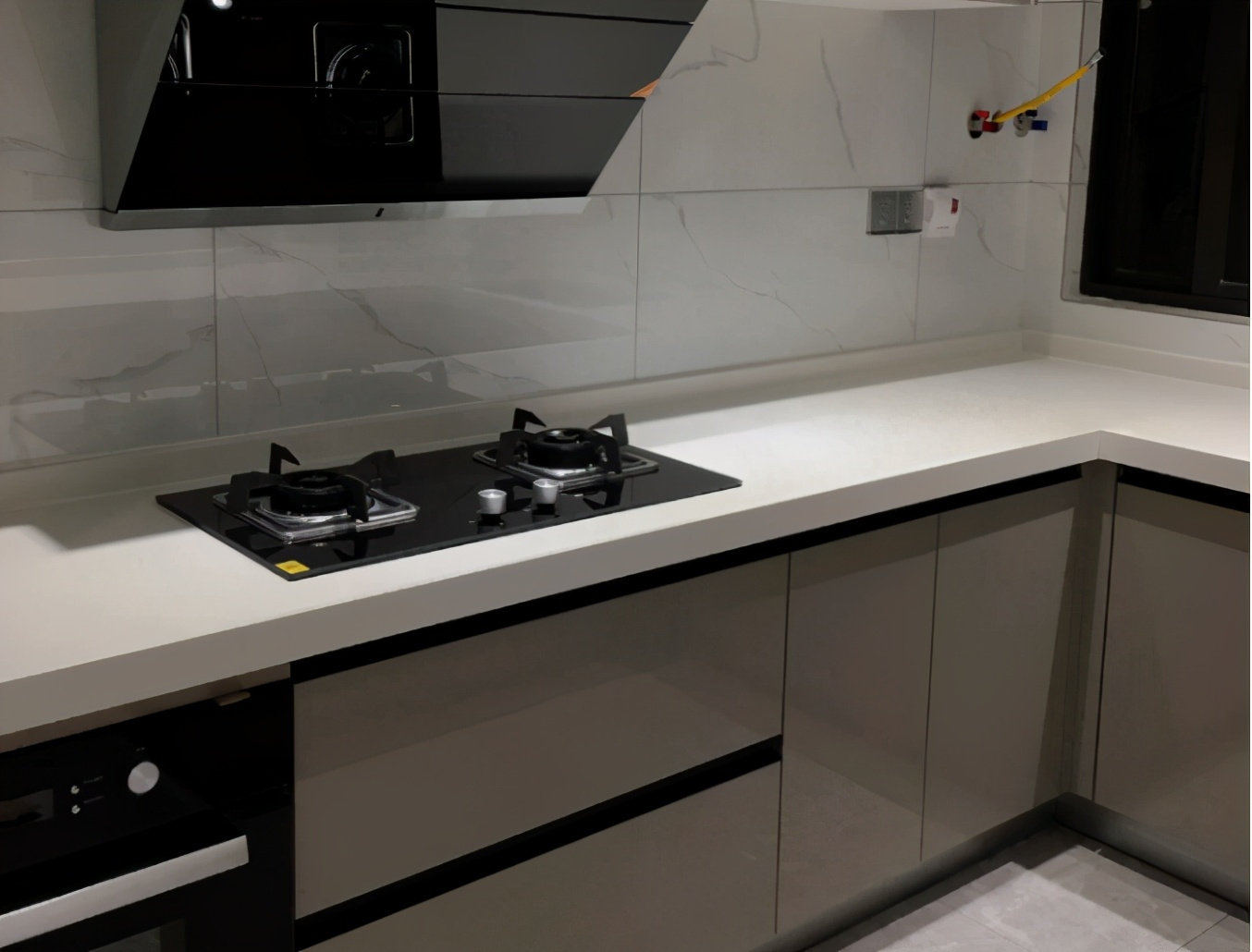 ⑤臺(tái)面材質(zhì)很多人愿意用石英石,因?yàn)樗鼜?qiáng)度大,硬度高,價(jià)格也很實(shí)惠,所以受歡迎很正常。