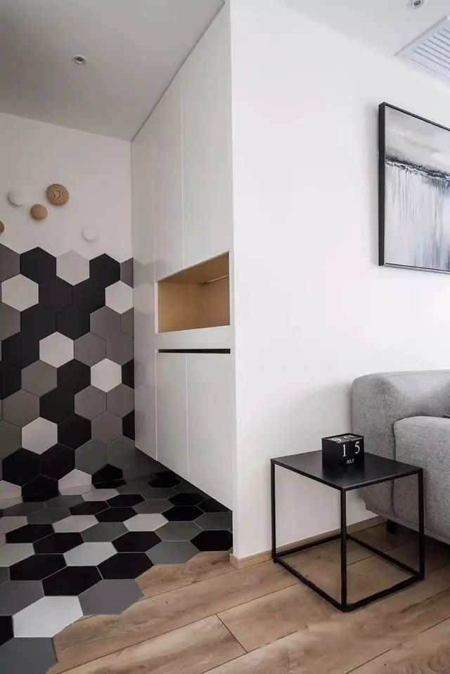 清新文藝的六邊磚是現(xiàn)在許多年輕人喜歡的設(shè)計(jì),把它用在玄關(guān)處也是一個(gè)不錯(cuò)的選擇,灰白黑的六邊磚帶來(lái)簡(jiǎn)潔、輕松的感覺(jué)。