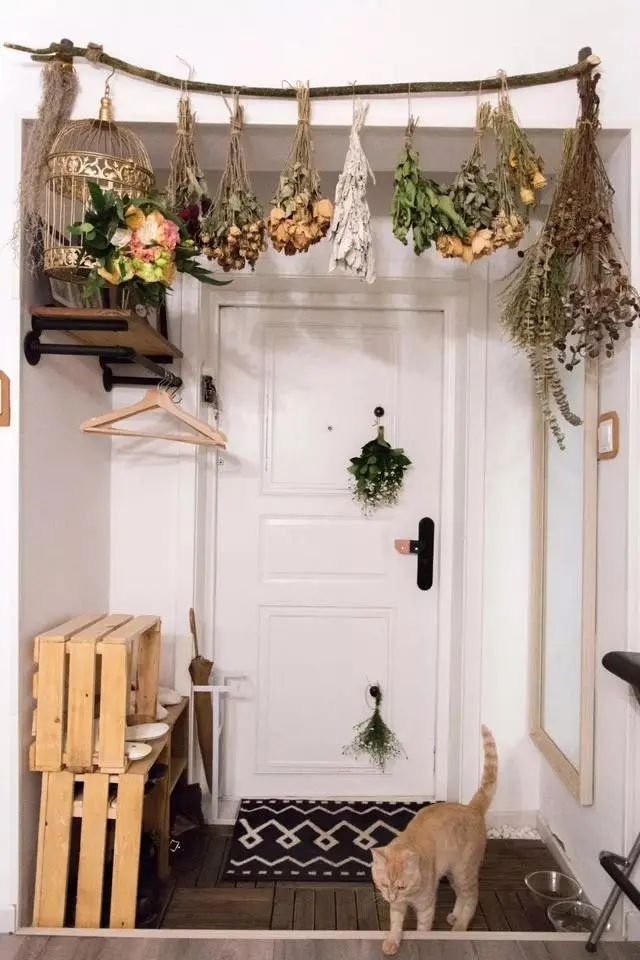 玄關(guān)除了鋪貼瓷磚外,也可以選擇鋪貼防腐木、木地板等,防腐木搭配門上的干花綠植裝飾,讓人一進(jìn)門就感覺(jué)到復(fù)古、鄉(xiāng)村的氣息。