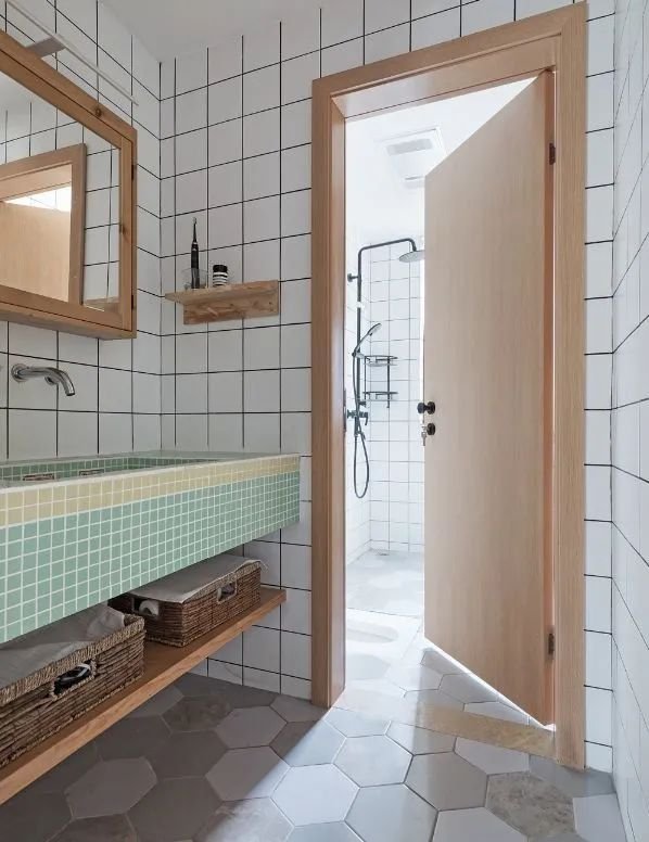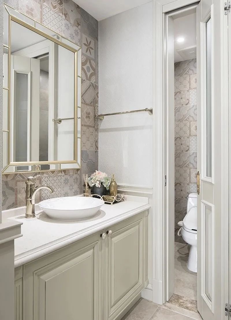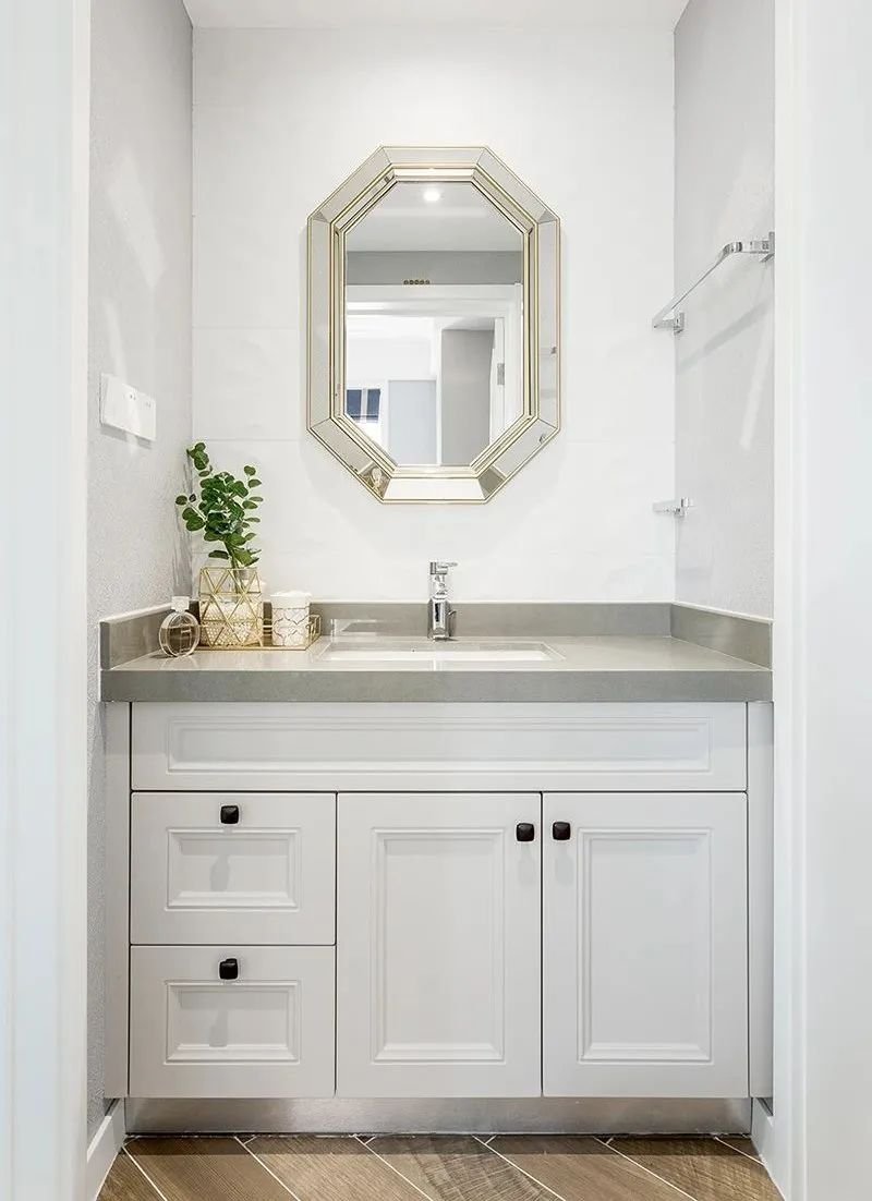把洗手臺獨(dú)立出來,即將干區(qū)(洗手臺)設(shè)置在衛(wèi)生間門口的過道上,座便器和淋浴房或浴缸保留在衛(wèi)生間里面,這樣不僅輕松實(shí)現(xiàn)干濕分區(qū),而且因?yàn)橄茨樑栉恢弥皇钦剂斯貌糠值囊恍K地方,過道也不會感覺到擁擠。