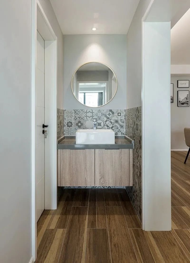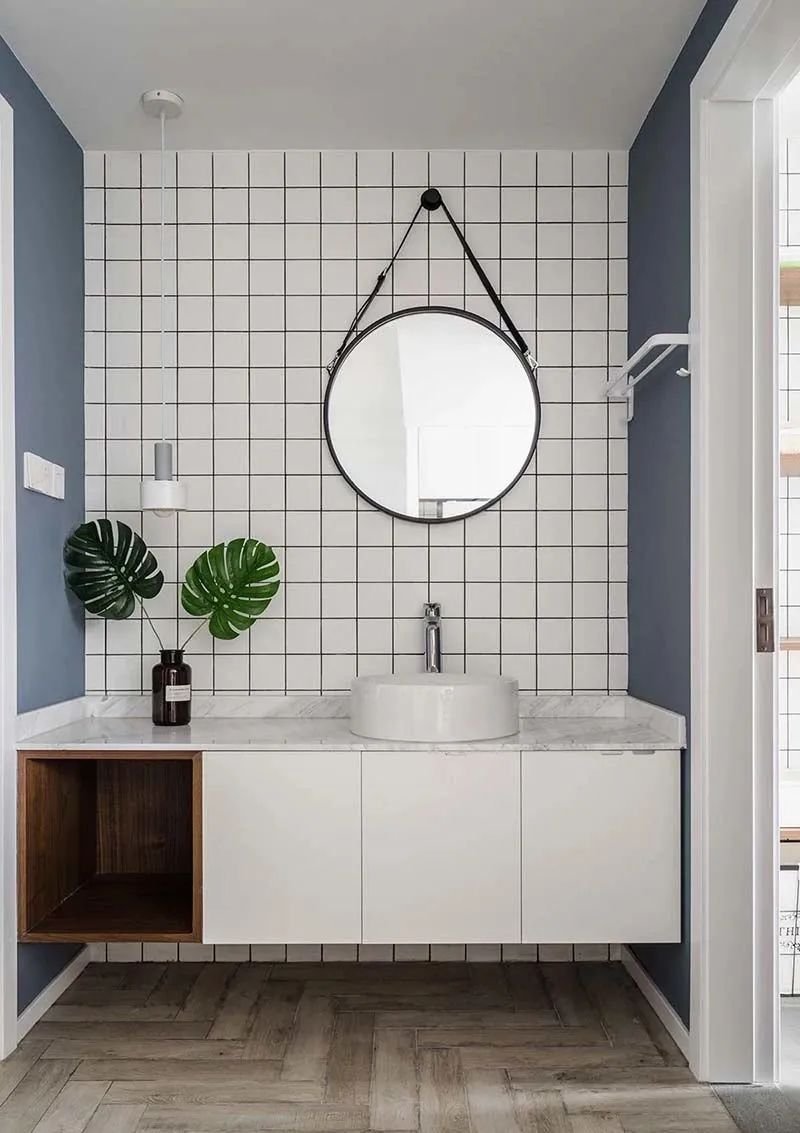 和墻面一樣,地面也建議使用瓷磚,如果要鋪木地板的話,記得在洗手臺旁邊安好門檻石,讓兩種材質(zhì)得到分隔的效果。