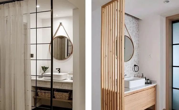 洗手臺外移后,可能會覺得光禿禿有點(diǎn)不美觀,所以空間足夠的話,可以做上隔斷進(jìn)行遮擋,像是黑框玻璃、鏤空隔斷都是個不錯的選擇~